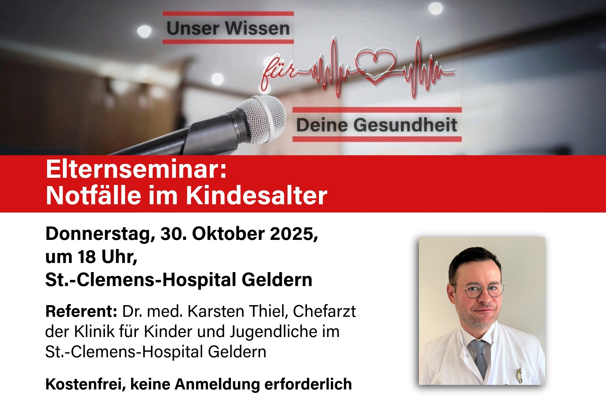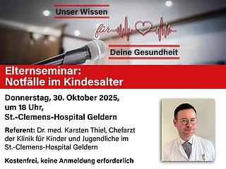 Diese und alle weiteren Fragen, die Eltern ihren Kinderarzt immer schon einmal fragen wollten, behandelt das interaktive und kostenfreie Elternseminar „Notfälle im Kindesalter“ von Dr. med. Karsten Thiel, Chefarzt der Klinik für Kinder und Jugendliche, am Donnerstag, 30. Oktober 2025, um 18 Uhr im Vortragsraum (4. Obergeschoss) des St.-Clemens-Hospitals.